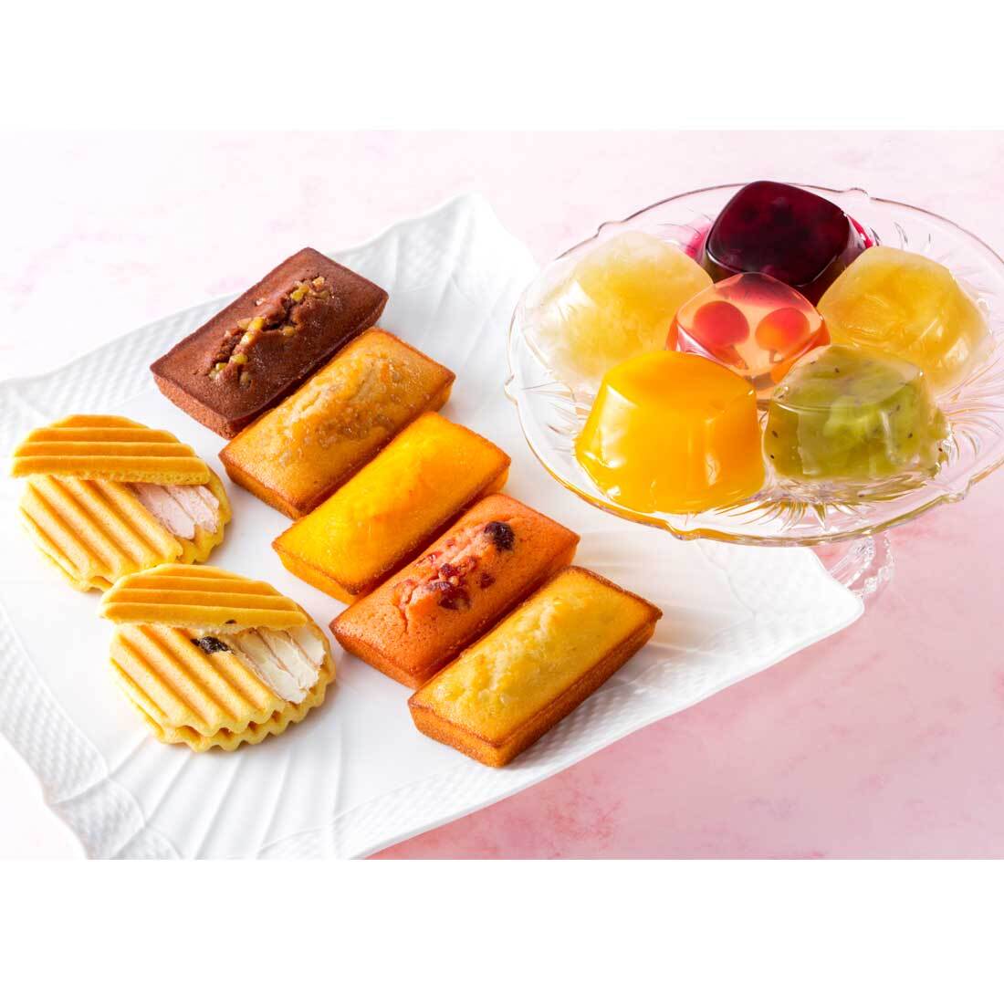 特徴 フルーティなゼリーと、果汁入りの生地に果肉をトッピングしたオリジナルフィナンシェ、ざっくりとした食感のクッキーにクリームをサンドしたヴァッフェル、バラエティに富んだ詰め合わせです。