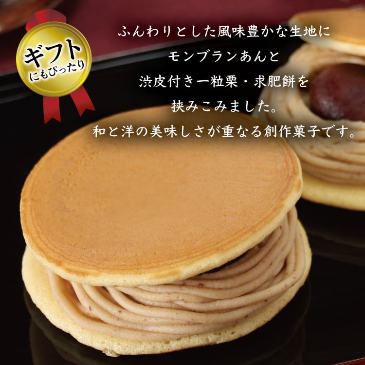 商品説明 ふんわりとした風味豊かな生地にモンブランあんと渋皮付き一粒栗・求肥餅を挟みこみました。
