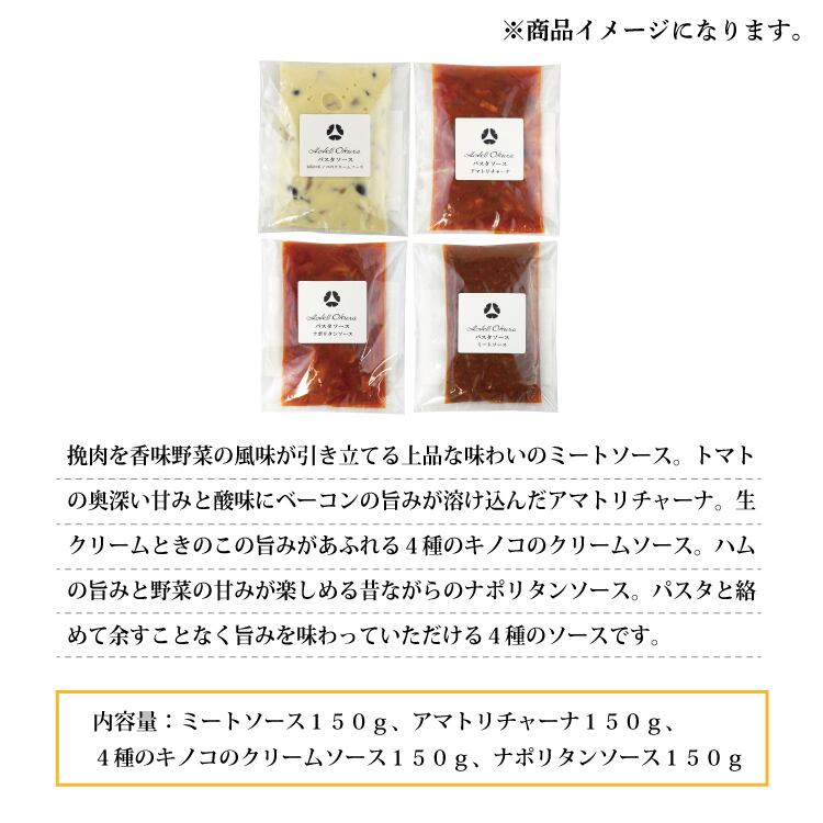商品内容 ミートソース150g、アマトリチャーナ150g、4種のキノコのクリームソース150g、ナポリタンソース150g