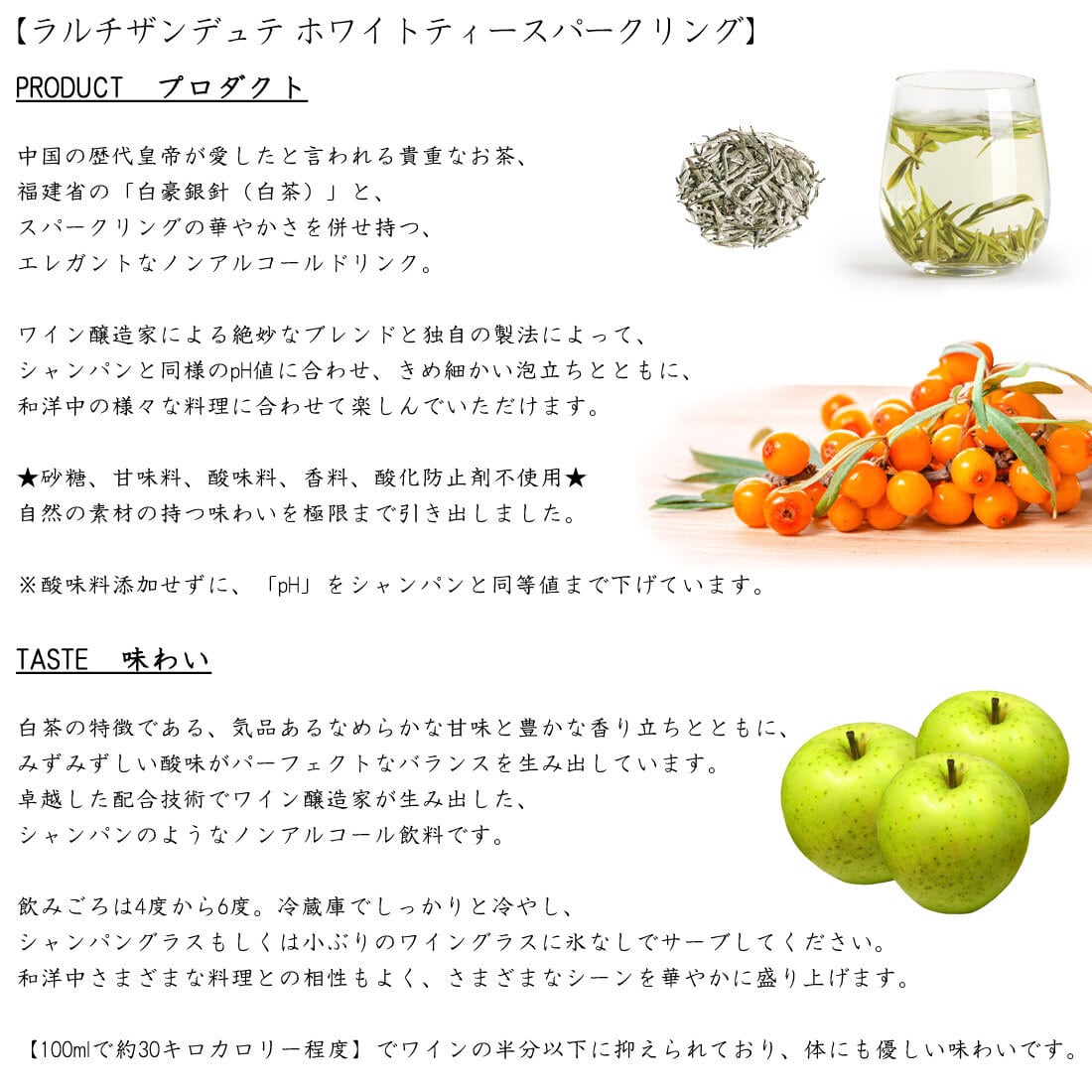 ホワイトティー・スパークリングの原材料は、白茶と青リンゴやブドウなどの果汁がベース。これらの原材料を独自の技術でブレンドし、自然の素材の持つ味わいを極限まで引き出しています。砂糖、甘味料、酸味料、香料、酸化防止剤は一切不使用。酸味料を添加せずにpH値をシャンパンと同等の3.2まで下げる独自の製法により、食中にも楽しめるキリっとした口当たりを実現しています。飲み応えもしっかりとあり、ワイン代わりのドリンクとしてもお勧めの本格的な味わいです。