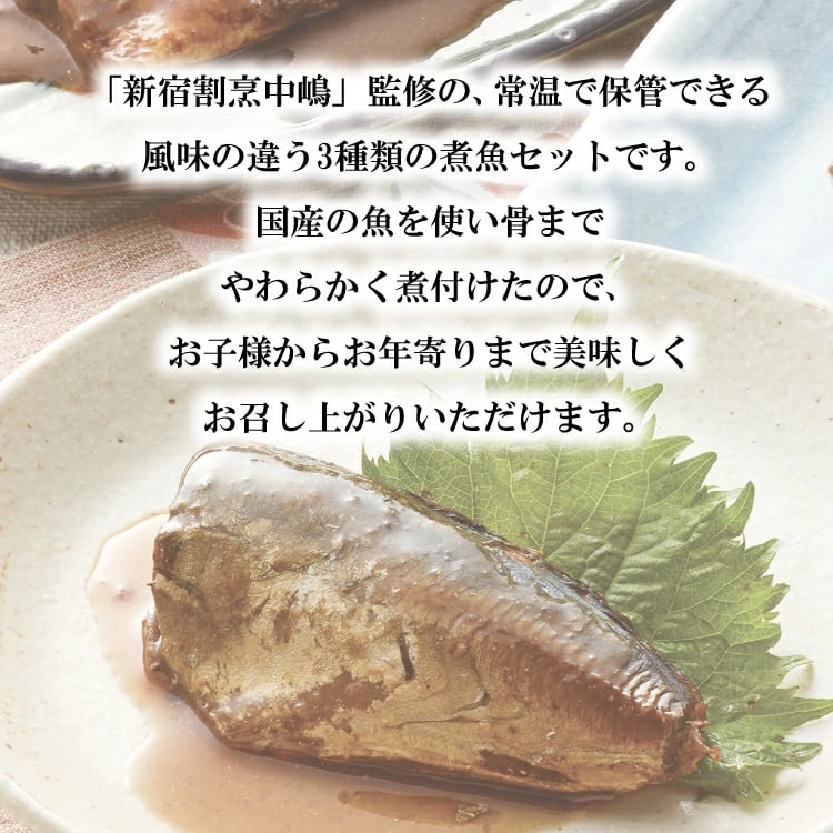 「新宿割烹中嶋」監修の、常温で保管できる風味の違う3種類の煮魚セットです。国産の魚を使い骨までやわらかく煮付けたので、お子様からお年寄りまで美味しくお召し上がりいただけます。